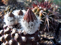 Areolen stark weißfilzig, zu einem weißen Scheitelschopf zusammenfleißend